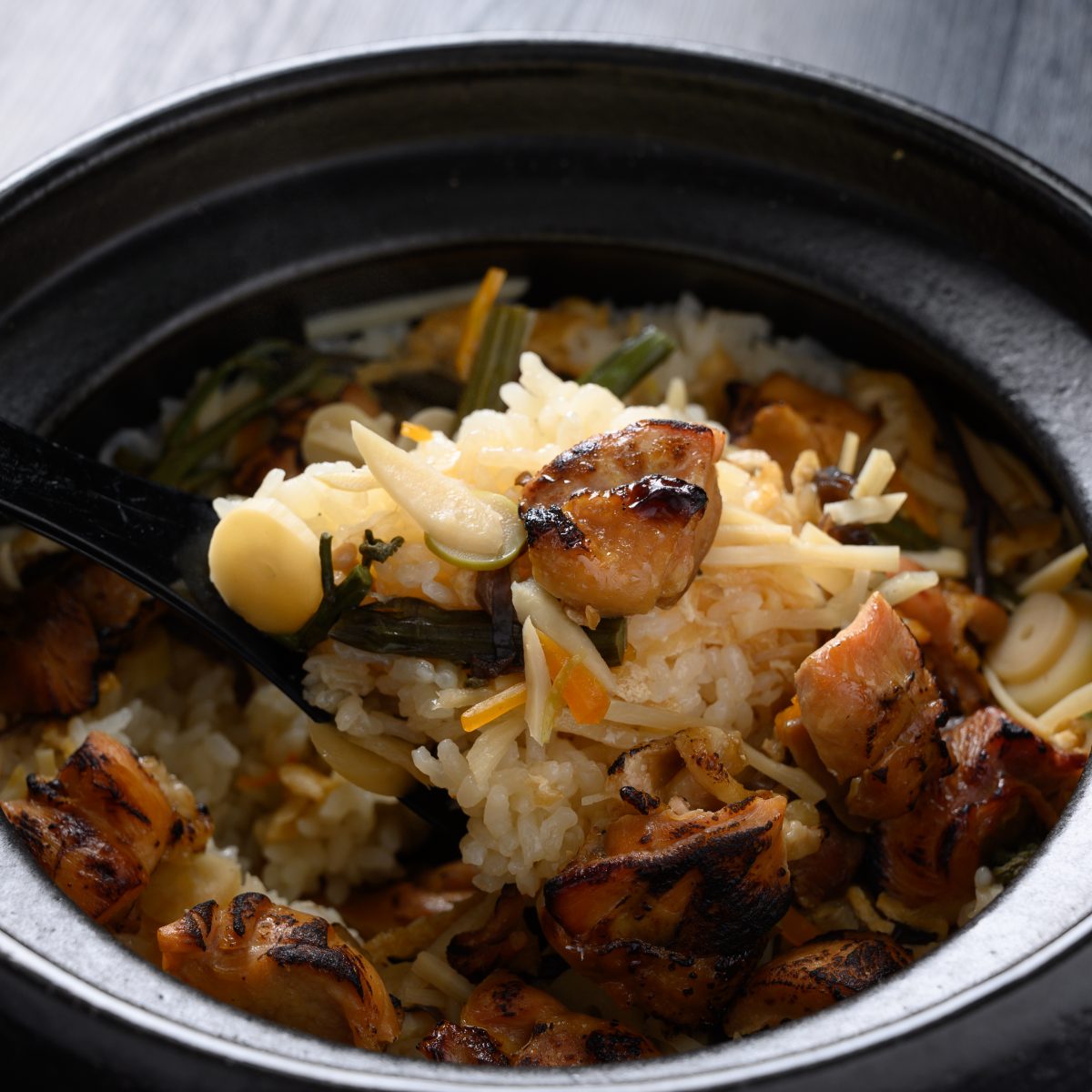鶏肉の旨みに季節の山菜が風味を添える、ボリュームも満点な釜めしです。