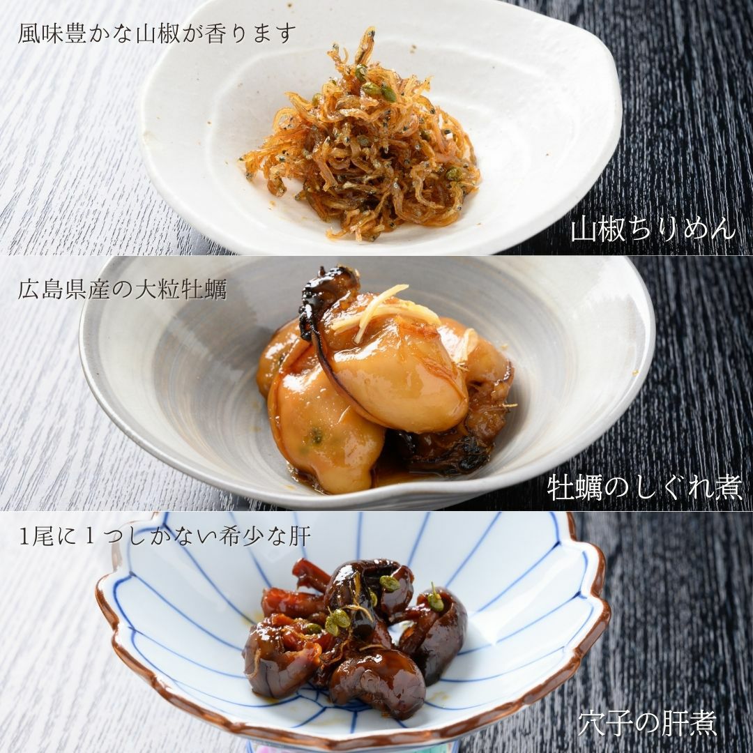みりん(国内製造)、ちりめんじゃこ(広島産)、醤油、日本酒、山椒、和風だし/調味料(アミノ酸等)、保存料(安息香酸Na)、酒精、酸味料、(一部に小麦・乳成分・大豆を含む)
